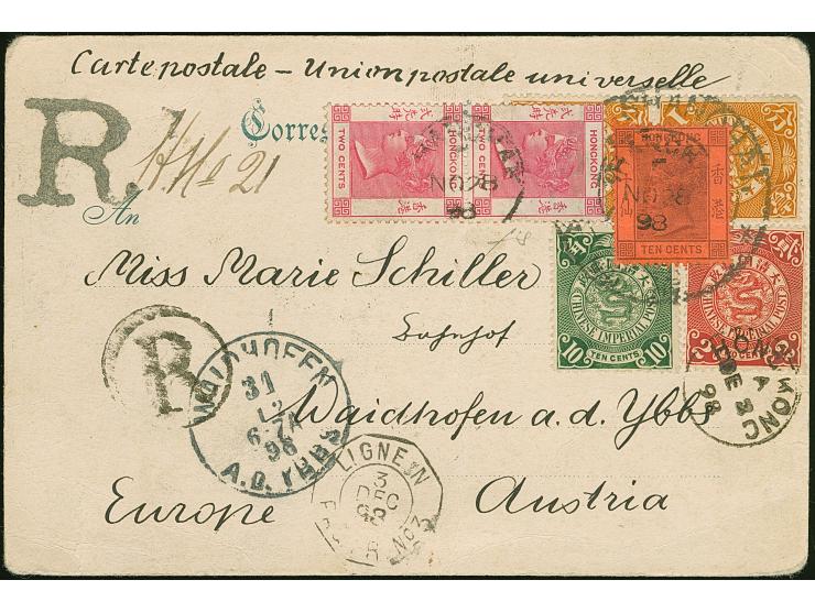 1 c. ocher vertical pair, 2 c. red and 10 c. green, tied by large cds “SHANGHAI” to registered postcard to Austria with additional Hong Kong 2 c. rose horizontal pair and 10 c. lilac/red tied in transit with small cds “HONG KONG NO 28 98”, handed over to French paquebot with hexagonal “LIGNE N 3 DEC 98” and registration circle handstamp “R” alongside, arrival “MAIDHOFEN 31 12 98”. The card with a vertical crease barely affecting one adhesive, fine. An attractive combination enhanced by the registration status
