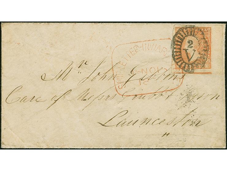 1854, Woodblock Issue 6 d. dull orange, imperforate, a fine used sheet marginal example (incl. part of bottom stamp) used on 1855 cover to Launceston, Tasmania tied by oval "2/V" obliterator and by framed SHIP LETTER - INWARDS FREE datestamp in red (Nov 15). Reverse with Geelong despatch (Nov 12), Melbourne transit and SHIP LETTER - INWARDS FREE diamond datestamp in red. Minor soiling, otherwise fine and an attractive maritime cover.