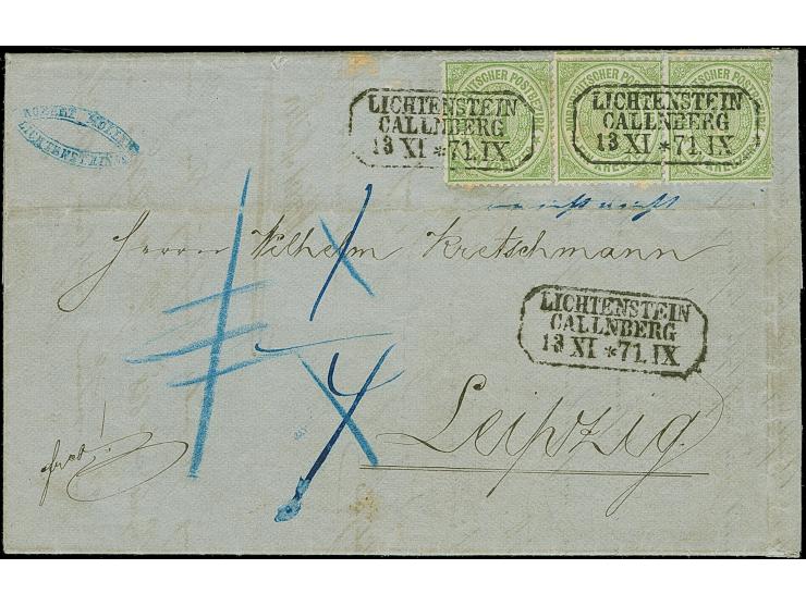 1 Kr. grün, 3 Werte im Streifen geklebt, währungsfremd verwendet, mit sauber auf- und nebengesetztem Ra3 "LICHTENSTEIN/CALLENBERG 13.XI.72" auf Faltbrief nach Leipzig. Handschriftlicher Vermerk reicht nicht, Blautaxen, wieder gestrichen. Faltungen außerhalb der Frankatur (rechte Marke ganz leichte Wellung). Ein interessanter Brief mit seltener Fremdverwendung.