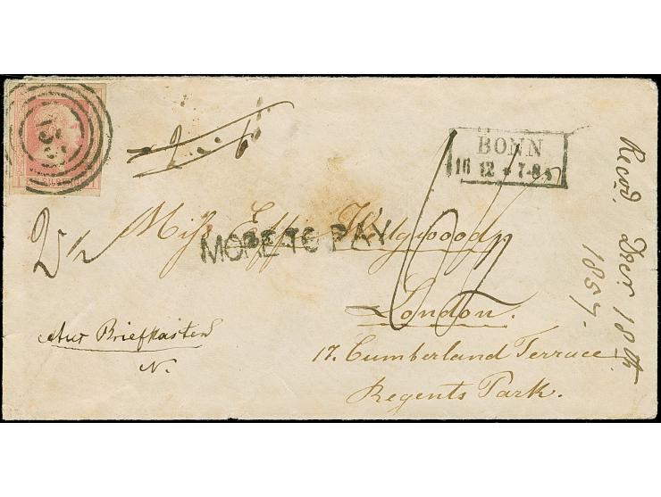 Glatter Grund, 1 Sgr. rosa, allseits vollrandig, mit zentrisch aufgesetzter Nr."155" auf kleinem Briefkuvert mit Ra2 "BONN 10 12" (1857) nach London; vorderseitig handschriftlich "Aus Briefkasten" und Taxierungen "2 1/2" und "6 1/2" in schwarzer Tinte sowie L1 "MORE TO PAY". Eine ungewöhnliche, versuchte Teilfrankatur des Inlandspotos. Signiert Flemming BPP