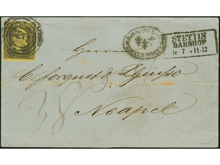 3 Sgr. auf gelb, breitrandig, mit Nr. "1439" und sauber nebengesetztem Ra3 "STETTIN BAHNHOF 18/7" (1857) auf komplettem Faltbrief über den Kirchenstaat, mit rückseitigem Transitstempel, nach Neapel, Königreich beider Sizilien. Die Frankatur bezahlte das Postvereinsporto, das verbleibende italienische Porto vorderseitig mit "38" Grana taxiert und vom Empfänger eingezogen. Gering unfrisch. Ein interessanter und seltener Auslandsbrief.
