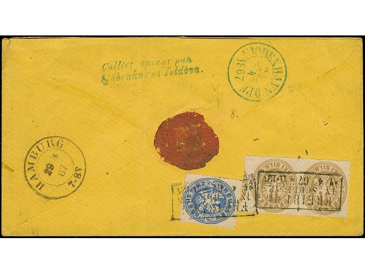 2 Sgr. ultramarin und waagerechtes Paar 3 Sgr. ocker, mit Ra3 "FREIBURG IN SCHLESIEN 25 4 67" auf Paketbegleitbrief über Hamburg nach Kopenhagen. Im Kuvert senkrechte Faltung außerhalb der Frankatur, sonst gute Erhaltung. Ein seltener Beleg der Auslands-Fahrpost; PROFI hat keinen weiteren frankierten Beleg nach Dänemark registriert.
