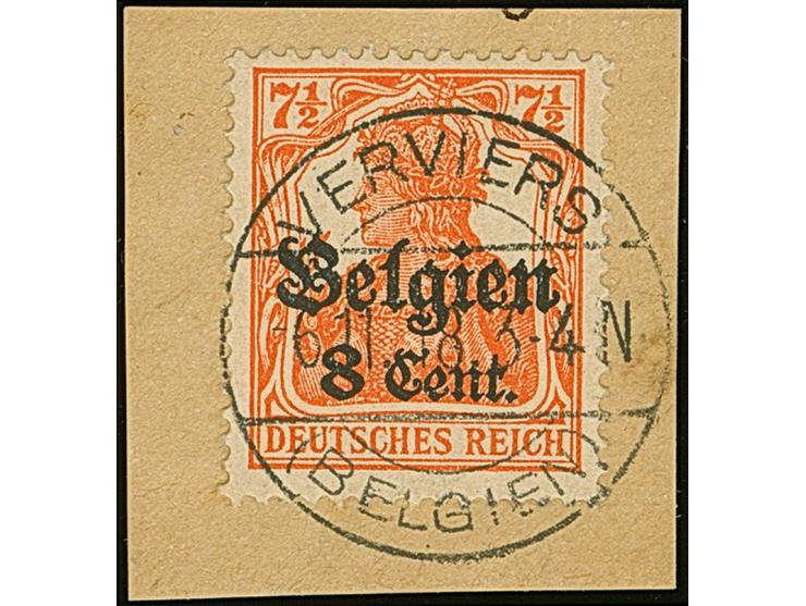 1916, Germania 8 C. auf 7½ Pfennig rötlichorange, Zwischenraum 1,3mm, sauber mit klarem Stempel “VERVIERS -9.11.18” auf Briefstück, tadellos, eine seltene Marke, sign. Hey BPP