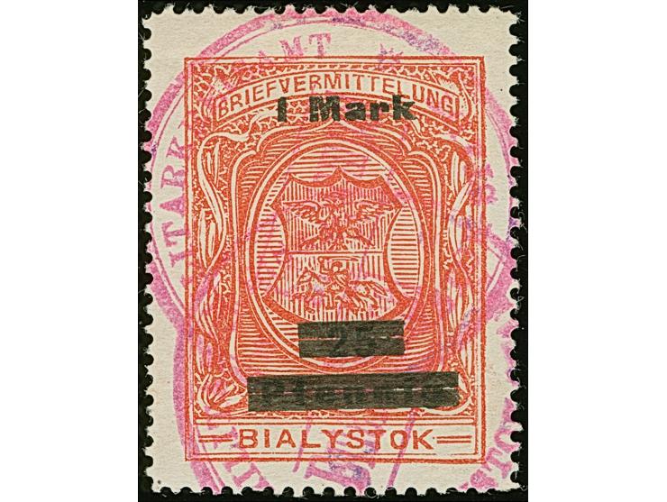 1916, 1 Mark auf 25 Pfennig lebhaftlilarot, ohne Namenszug, sauber mit rotem Stempel entwertet, tadellos