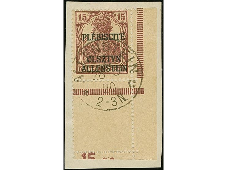 1920, Aufdruckausgabe Germania 15 Pfennig braunrot, aus der rechten unteren Bogenecke mit komplettem, gezähnten Leerfeld in Markengröße, im Unterrand noch Teile des Reihenzählers sichtbar, sauber mit Stempel “ALLENSTEIN 28 5 20” auf Briefstück, tadellos, selten, sign. Hey BPP