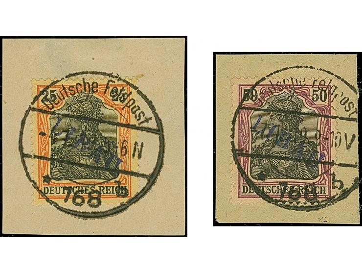 1919, Aufdrucktype II, violettblauer Aufdruck: Germania 5-50 Pfennig, dabei 20 Pfennig in beiden Farben, je farbfrisch und gut gezähnt, je sauber gestempelt auf Briefstücken, tadellos, jeder Wert u.a. sign. Schlegel BPP sowie Fotoattest Huylmans BPP (2026)