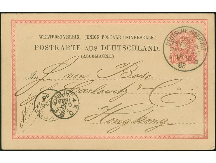 “DSP OST-ASIATISCHE-ZWEIGLINIE *a 18.10.88” (D. General Werder) klar auf Ganzsachenkarte 10 Pfg. mit Text und Datierung “An Bord General Werder 18/10/18” via Kobe nach Hongkong mit Ankunftsstempel vom 26.10.1888, in einwandfreier Erhaltung. Eine schöne Karte mit diesem seltenen Stempel