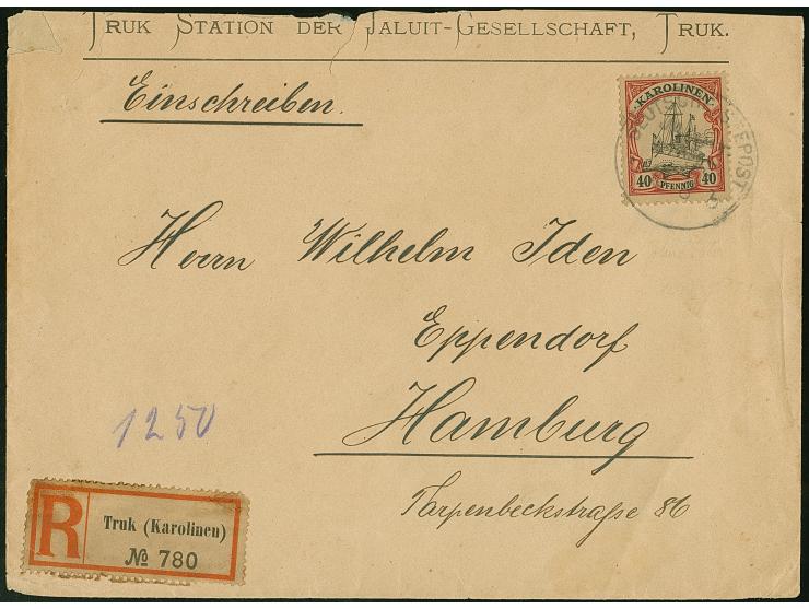 “DSP JALUIT-LINIE *b 10.8.(11)” recht klar ohne Jahreszahl auf Kaiseryacht 40 Pfg. als tarifgerechte Einzelfrankatur auf R-Vordruckbrief “TRUK STATION DER JALUIT-GESELLSCHAFT” mit R-Zettel “Truk (Karolinen)” nach Hamburg mit Ankunftsstempel. Der Umschlag oben leicht verkürzt und Randfehler, ansonsten in guter Gesamterhaltung