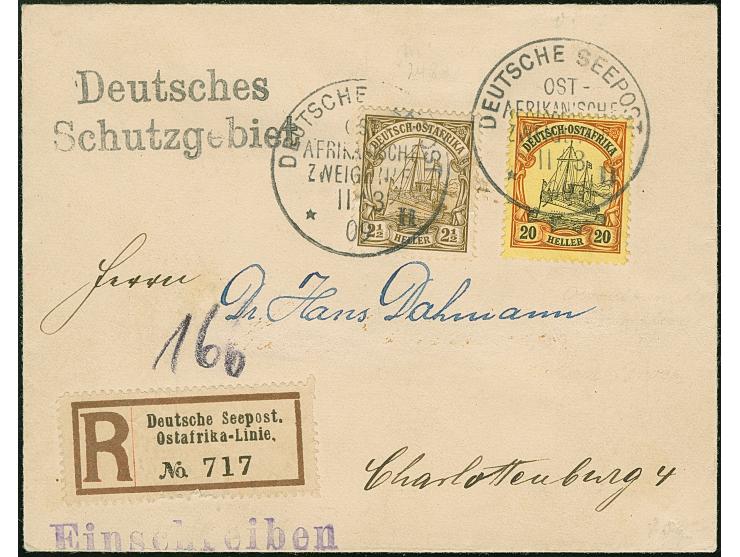 “DSP OST-AFRIKANISCHE ZWEIGLINIE *II 11.3.09” (D. Somali?) zweimal klar auf Kaiseryacht 20 H. ohne Wasserzeichen und 2½ H. mit Wasserzeichen als tarifgerechte Frankatur auf R-Brief mit R-Zettel “Deutsch Seepost. Ostafrika-Linie.” nach Charlottenburg. Teil der Adresse radiert und neu beschriftet, ansonsten in guter Erhaltung