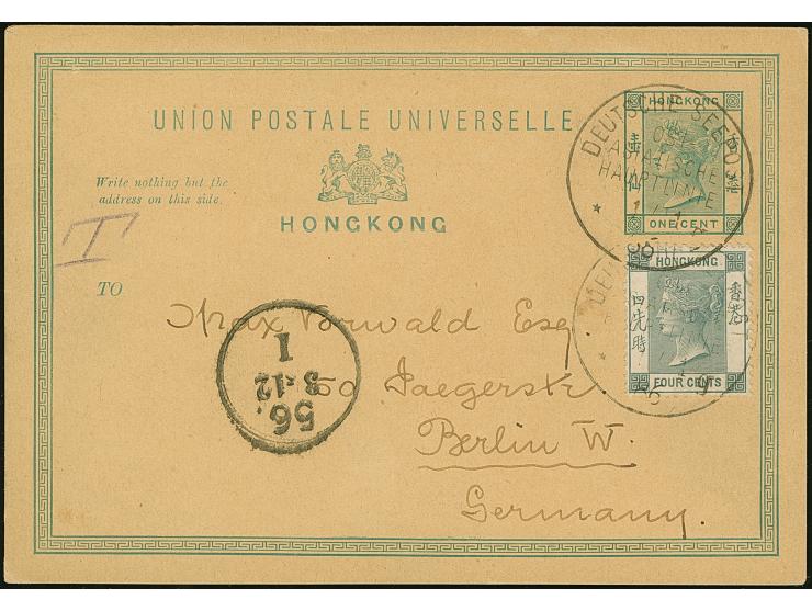 “DSP OST-ASIATISCHE HAUPTLINIE *g1.1.1886” (D. Nürnberg) zweimal klar auf Hongkong Ganzsachenkarte 1 C. mit Zufrankatur 4 C. grauschiefer und Grußtext nach Berlin mit Ankunftsstempel, in einwandfreier Erhaltung