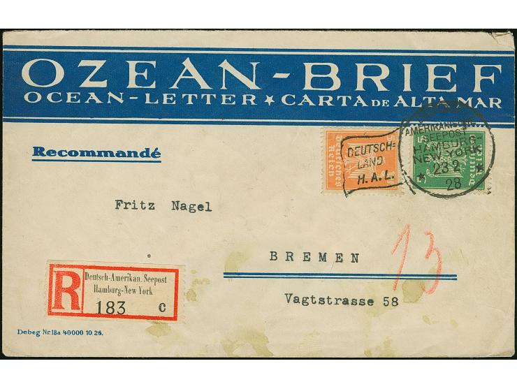 1928, “DASP HAMBURG-NEW YORK 23.2.28 DEUTSCHLAND H.A.L.” Flaggenstempel klar auf Adler 5 und 50 Pfg. als tarifgerechte Frankatur auf R-OZEAN-BRIEF mit R-Zettel “Deutsch-Amerikan. Seepost Hamburg-New York” nach Bremen mit Ankunftsstempel und rückseitig mit L1 “Deutschland ddt” und Verschlussmarke der Debeg. Der Umschlag mit kleinen Wasserflecken, ansonsten in guter Erhaltung