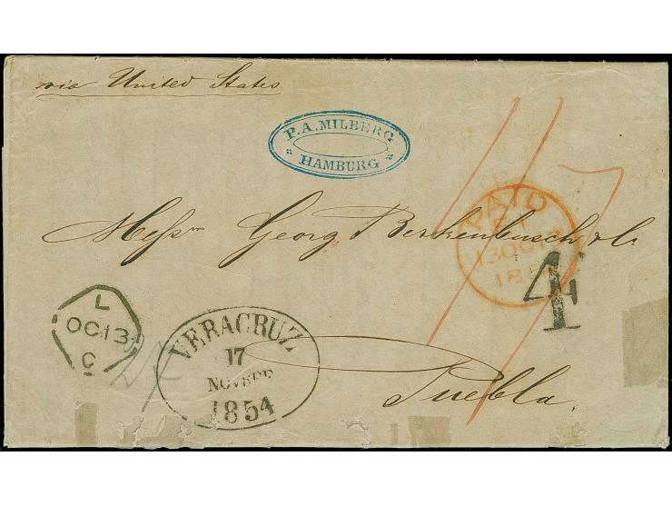 1854, kompletter Faltbrief mit Absenderstempel “P.A. MILBERG HAMBURG” nach London expediert. Ab dort befördert mit rotem EKr. “PAID 13.OCT. 1854” und Tax-Vermerk “1/7” (1 Shilling 7 Pence) sowie Leitvermerk “via United States” via “VERAGRUZ 17.NOVBR.1854” mit Tax-Stempel “4” (Reales) nach Puebla. Die 4 Reales für die Inlandsbeförderung wurde vom Empfänger eingezogen. Der Faltbrief unten mit kleinen Fehlstellen und Tesa-Spuren, ansonsten in guter Gesamterhaltung. Ein sehr früher Brief mit Destination Mexiko