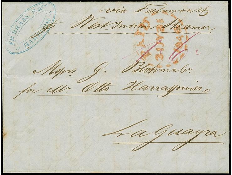 1846, kompletter Faltbrief mit Absenderstempel “Fr. BRAASCH & CO. HAMBURG” und Leitvermerk "via Falmouth p. West-India Steamer. Von Falmouth mit rotem EKr. “PAID 31.JY.1846” und Tax-Vermerk “1/6” (1 Shilling 6 Pence" nach La Guayra befördert, in einwandfreier Erhaltung. Ein früher Brief mit Destination Venezuela