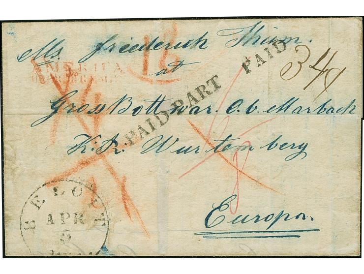 1850, “AMERICA ÜBER BREMEN” roter L2 und schwarzer L1 “PAID PART” auf Faltbriefhülle von “BELOIT WI APR.5” via New York nach Grossbottwar mit Ankunftsstempel. Vorderseitig mit geänderten Tax-Vermerken, übliche Falt- und Altersspuren