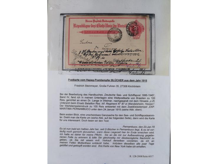 1905/15, kleine Partie zum Thema Dampfer Blücher mit  vier Postkarten/Brief mit Seepoststempeln, eine Schiffspostkarte und eine Karte von der Nordlandfahrt 1906 mit Spitzebergen-Marken 5 Öre grün und 5 Öre auf 20 Öre rot mit Nebenstempel “SPITZBERGEN Blücher 13.Juli1906”. Dazu Brasilien Ganzsachenkarte 100 R. aus Pernambuco mit interessantem Text “Es ist nun bald ein halbes Jahr her, seit D. Blücher in Pernambuco liegt…”, sowie kompletten Text des Artikels von F. Steinmeyer