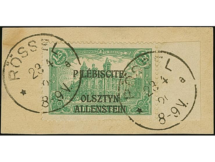 1920, 1,25 Mark, rechtes Seitenrandstück, mit Aufdruckfehler "P und L von PLÉBICITE auseinanderstehend" (Feld 20 einer Teilauflage), sauber mit EKr. “RÖSSEL 23 4 20” auf Briefstück, tadellos, gestempelt eine seltene Marke, sign.