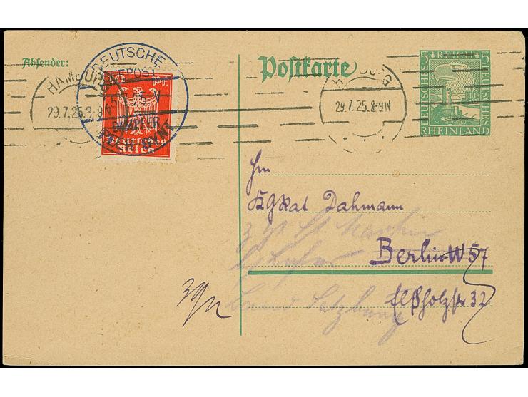“DSP DAMPFER PEER GYNT 25.7.25” in Violett klar auf Dahmann-Ganzsachenkarte ohne Text, frankierte Schiffspostkarte mit violettem Nebenstempel "Zur Erinnerung…Peer Gynt der Reederei Viktor Schuppe…" und in der Mitte geteiltes Telegramm von Spitzbergen 1924 an den D. Peer Gynt. Dazu stark gebrauchte Speisekarte “Festmal beim Kalifen Harun al Raschid” und Prosprekt “Nordlandfahrten 1925”
