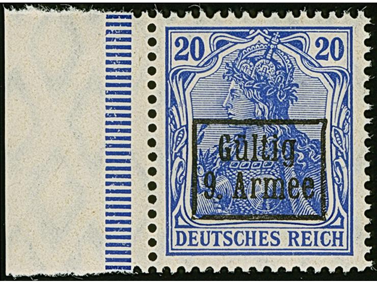 1918, Gültig 9. Armee, Germania 20 Pfennig hellblauviolett, Friedensdruck, linkes Seitenrandstück, farbfrisch und gut gezähnt, postfrisch,tadellos, unsigniert mit Fotoattest Wasels BPP (2018)