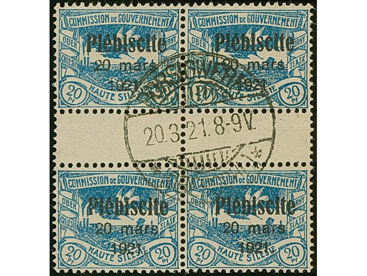 1921, Plebiscite 20 Pfennig kobaltblau, Viererblock mit zwei senkrechten Zwischenstegpaaren, farbfrisch und gut gezähnt, sauber gestempelt “BORSIGWERK 20.3.21”, tadellos, eine sehr seltene und attraktive Einheit, Fotoattest Gruber BPP (2001)