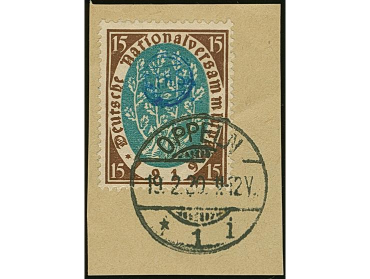 1920, Nationalversammlung 15 Pfennig siena/schwärzlichtürkisblau, farbfrisch und gut gezähnt, sauber mit Stempel “OPPELN 19.2.20” auf Briefstück, ein winzig verkürzer Zahn, sonst tadellos, u.a. sign. Weinberg BPP mit Fotoattest (1991)
