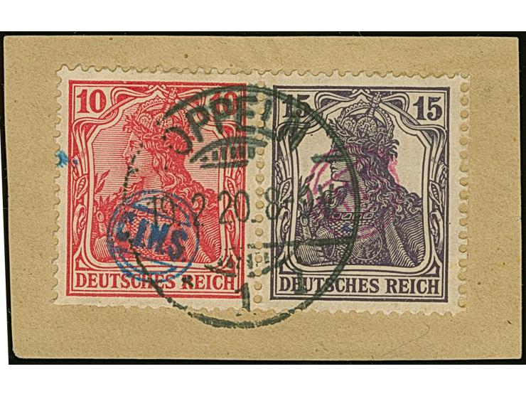 1920, Germania 10+15 Pfennig im waagerechten Zusammendruck, dabei die 10 Pfennig mit blauem und die 15 Pfennig mit rotem Handstempelaufdruck, farbfrisch und gut gezähnt, unten übliche Heftchenzähnung, sauber mit Stempel "OPPELN 19.2.20" auf Briefstück, tadellos. Eine der großen Seltenheiten, es ist in dieser Form nur ein weiteres gebrauchtes Stück bekannt, sign. MH sowie Fotoattest Gruber BPP (2005)