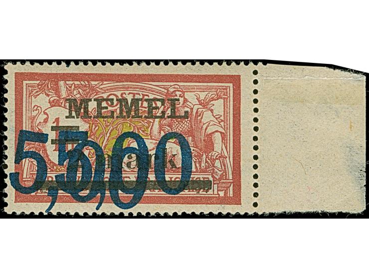 1922, 5,00 auf 2 mark auf 1 Franc, mit klarem um ca. 6,5mm nach links verschobenem Doppelaufdruck, rechtes Seitenrandstück, postfrisch, Falz lediglich auf dem Seitenrand, tadellos bzw. dünne Stelle nur im Seitenrand, eine seltene und attraktive Marke, sign. und Fotoattest Huylmans BPP (2013)