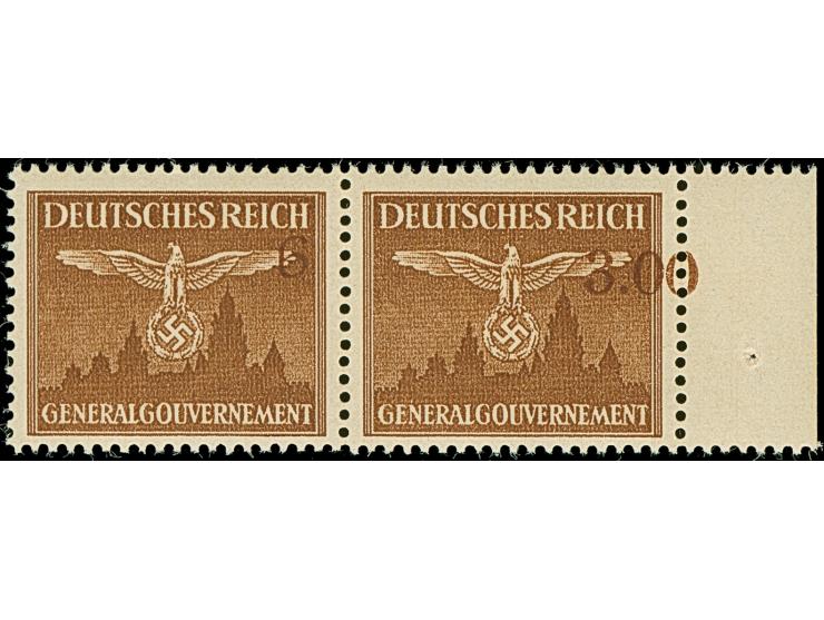 1943, Hoheitszeichen 6 Groszy im waagerechten Randpaar mit markant nach links verschobenem Werteindruck, dadurch auf der rechten Marke große Teile des Reihenwertzählers “3.00” sichtbar, postfrisch, tadellos, selten, sign. Jungjohann BPP