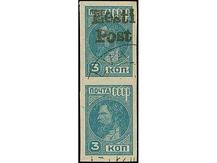 1941, 3 Kopeken dunkelgrünlichblau, senkrechtes Paar, dabei die untere Marke ohne Aufdruck, sauber gestempelt, tadellos. ProFi hat lediglich 8 derartige Paare registriert, dabei ein Viererblock, u.a. sign. Puloaas und Keiler BPP sowie Fotoattest Krischke (2005)