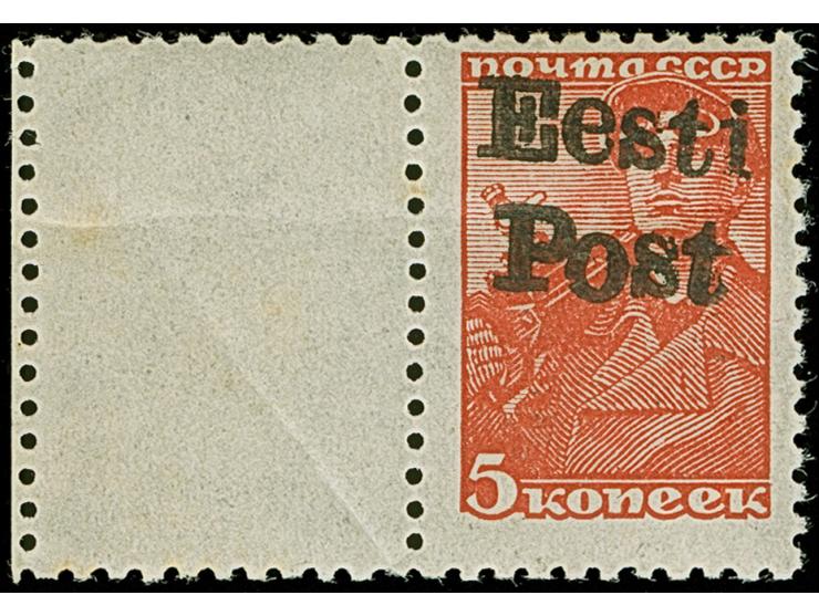 1941, 5 Kopeken bräunlichrot, linkes Seitenrandstück mit gezähntem Leerfeld in Markengröße, postfrisch, winzig fleckig, das Leerfeld mit stärkerem herstellungsbedingtem Kalanderbug, sonst tadellos, in dieser Form sehr selten, ProFi hat lediglich zwei weitere postfrische sowie zwei gestempelte Stücke registriert, u.a. sign. Krischke BPP mit Fotoattest (1987)