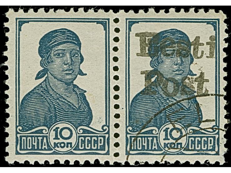 1941, 10 Kopeken dunkelpreußischblau, waagerechtes Paar, dabei die linke Marke ohne Aufdruck, farbfrisch und gut gezähnt, sauber gestempelt, tadellos. Eine sehr seltene Einheit, ProFi hat kein weiteres Stück registriert, sign. EKeiler sowie Fotoattest Krischke BPP (1992)