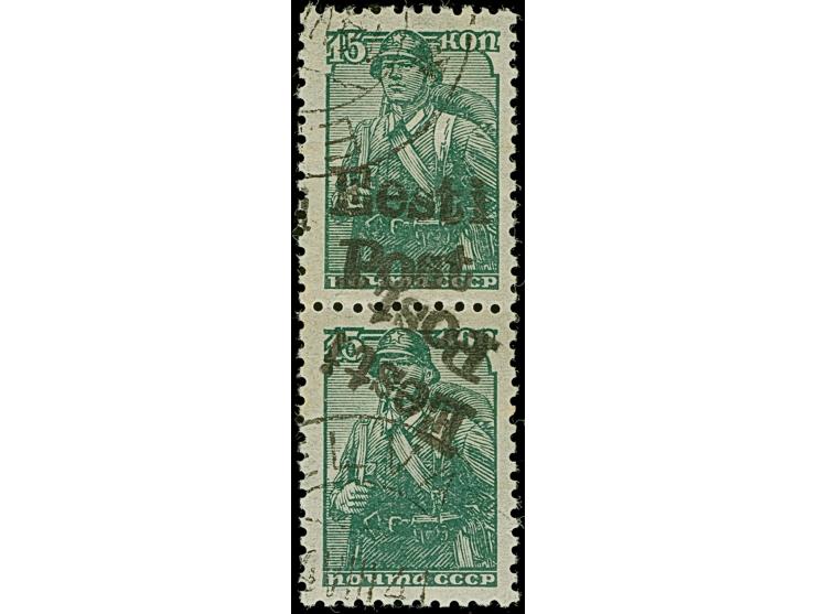 1941, 15 Kopeken dunkelgraugrün, senkrechtes Kehrdruckpaar, die obere Marke mit normalstehendem, die untere Marke mit schräg kopfstehendem Aufdruck, farbfrisch und gut gezähnt, sauber gestempelt, tadellos, sehr selten, sign. Nemvalz und Keiler BPP sowie Fotoattest Krischke BPP (1986)