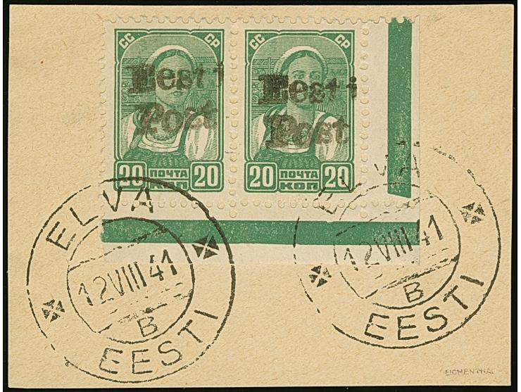 1941, 20 Kopeken schwarzgelbgrün, waagerechtes Paar aus der rechten unteren Bogenecke, farbfrisch und gut gezähnt, sauber mit Stempel “ELVA 12 VII 41" auf Briefstück, tadellos und sehr dekorativ, sign. Nemvalz sowie Klein BPP