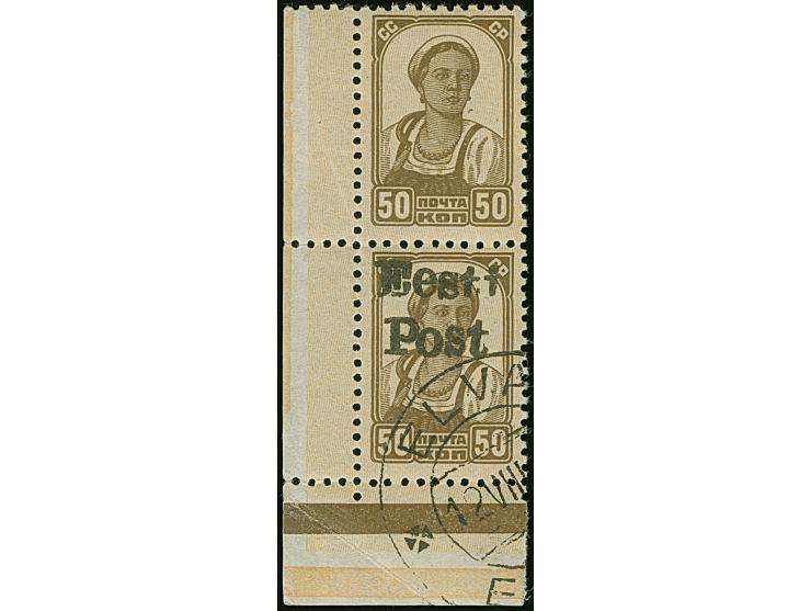 1941, 50 Kopeken braun, senkrechtes Paar aus der linken unteren Bogenecke, dabei die obere Marke ohne Aufdruck, farbfrisch und gut gezähnt, sauber gestempelt, tadellos, leichte Büge nur im Eckrand. Eine sehr seltene Einheit, ProFi hat nur ein weiteres Stück registriert, unsigniert mit Fotoattest Krischke BPP (1997)
