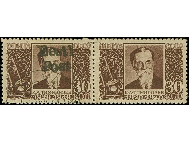 1941, Timirjasev 30 Kopeken schwarzrotbraun, waagerechtes Paar, dabei die rechte Marke ohne Aufdruck, farbfrisch und gut gezähnt, sauber gestempelt, tadellos. Eine große Seltenheit, ProFi hat lediglich ein weiteres Stück registriert, u.a. sign. Puloaas und Nemvalz sowie Fotoattest Krischke (2010)