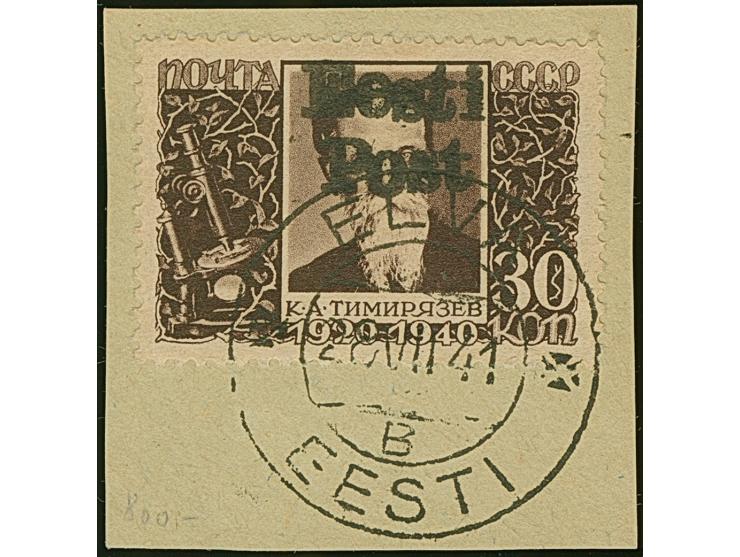 1941, Timirjasev 30 Kopeken schwarzrotbraun, farbfrisch und gut gezähnt, sauber mit Stempel “ELVA 28 VII 41” auf Briefstück, tadellos, sign. Krischke BPP