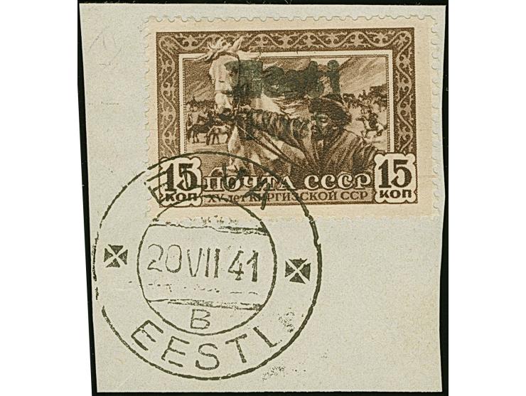 1941, Kirgisische SSR 15 Kopeken schwarzorangebraun, farbfrisch und gut gezähnt, sauber mit Stempel “ELVA 20.VII 41” auf Briefstück, tadellos. Eine der großen Seltenheiten, ProFi hat lediglich 5 Exemplare registriert, davon dürfte das vorliegende das schönste Stück sein, sign. Puloaas sowie Fotoattest Krischke BPP (1984)