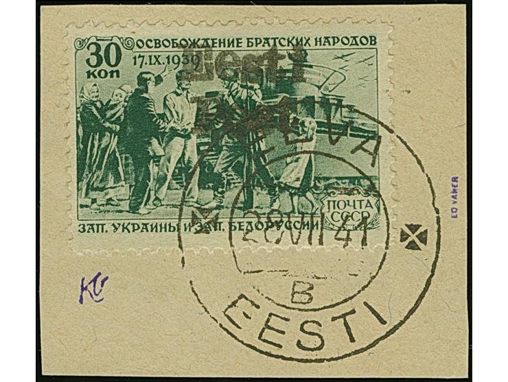1941, West-Ukraine und West-Weißrussland 30 Kopeken schwarzopelgrün, farbfrisch und gut gezähnt, sauber mit Stempel “ELVA 28.VII 41” auf Briefstück, tadellos. Eine der großen Seltenheiten, ProFi hat lediglich 5 Exemplare, davon zwei postfrische, registriert. Davon dürfte das vorliegende das schönste Stück sein, u.a. sign. Vaher und Puloaas sowie Fotoattest Löbbering BPP (2010)