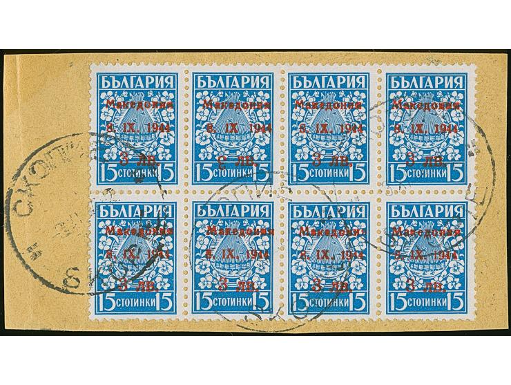 3 L. auf 15 St. mit Aufdruck in Type II im waagerechten 8er-Block, dabei haben die 1. und 3. Marke von links in der oberen Reihe den Aufdruckfehler “M von Makedonia unten ohne Serifen" und die 2. Marke von links die Aufdruckabart ”Wertziffer 3 kopfstehend". Jeweils mit Stempel “SKOPIE 3.XI.44” auf Briefstück und in einwandfreier Erhaltung. Eine in dieser Kombination nicht häufige Einheit, Fotoattest Dr. El Majdoub BPP (2025)
