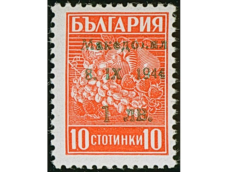 Probeaufdruck 1 L. auf 10 St. mit grünem Aufdruck in Type II und Aufdruckfehler “fehlender Punkt nach IX” bzw. im Aufdruck “МАКЕДОНИЯ” ist das “H” verstümmelt und das “Л” statt “Я” im Klischee verwendet worden. Die postfrische Marke ist in tadelloser Erhaltung und in Verbindung mit den Aufdruckfehlern vermutlich einmalig, sign. Karaivanoff und Hristov BPP sowie Fotoattest Dr. El Majdoub BPP (2025): “..Diese Aufdruckfehler sind bisher unbekannt”
