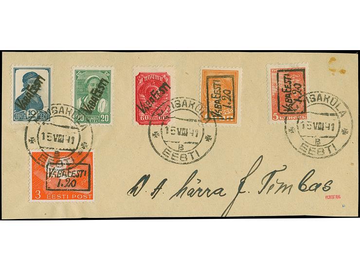 1941, 10 Kopeken - 1,20 auf 5 Kopeken, je farbfrisch und gut gezähnt, sauber mit Stempel “MOISAKÜLA 15 VIII 41” auf großem Briefstück, tadellos, die 3 S. mit einer Auflage von nur 80 Stück, sehr selten, sign. Eichenthal und Fotoattest Krischke BPP (1990)