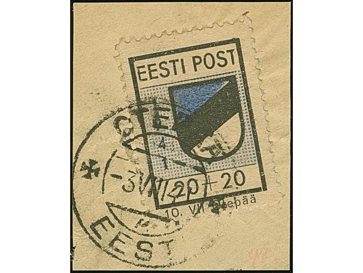 1941, Wappenschild 20 Kopeken, gezähnt, Type II, mit Plattenfehler “T von POST ohne Querbalken”, farbfrisch und gut gezähnt, sauber mit Stempel “OTEPÄÄ -3.VIII-41” auf Briefstück, tadellos, u.a. sign. Krischke