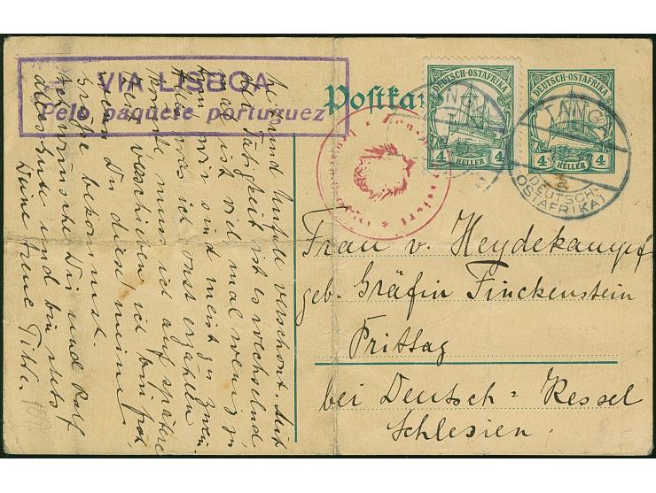 1915, Kaiseryacht 4 H. mit Wasserzeichen als Zufrankatur auf Ganzsachenkarte 4 H. mit Stempel “TANGA DOA a 9.9.15”  und rotem Zensurstempel “Zensur passiert DOA” sowie violettem Leitstempel “VIA LISBOA Pelo paquete portugez”, adressiert nach Prittag in Schlesien. Die Karte wurde trotz des Leitstempels in Portugiesisch-Ostafrika von den Engländern angehalten und erst in 1919 zugestellt mit handschriftlichem Eingangsvermerk "Eingegangen 20.9.19. Die Karte mit waagerechter und senkrechter Faltung, ansonsten in noch guter Gesamterhaltung. Trotz der Einschränkungen eine außergewöhnliche Postkarte aus DOA mit sehr seltenem Leitstempel, Fotoattest R. STeuer BPP (2017)