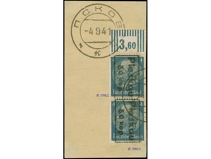 1941, Nicht ausgegeben: Hindenburg 4 Pfennig schwärzlichgrauultramarin mit Handstempelaufdruck “Pleskau 60 Kop”, senkrechtes Oberrandpaar, farbfrisch und gut gezähnt, sauber mit Stempel “PSKOV -4 9 41” auf Briefstück, tadellos. Eine der großen Seltenheiten, ProFi hat lediglich 6 Stück registriert, dabei keine weitere Einheit, sign. Dr. Schultz sowie Fotoattest Zirath BPP (2015)