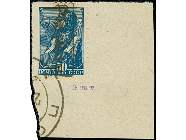 1941, “Pleskau”, Handstempel ohne Wertangabe, Probeaufdruck auf 30 Kopeken dunkelviolettultramarin, farbfrisch, sauber mit Teilstempel auf Briefstück, einige Zähne gering verkürzt, sonst tadellos, in gestempelter Erhaltung sehr selten, sign. Keiler BPP sowie Dr. Schultz und Fotoattest Zirath BPP (2010)