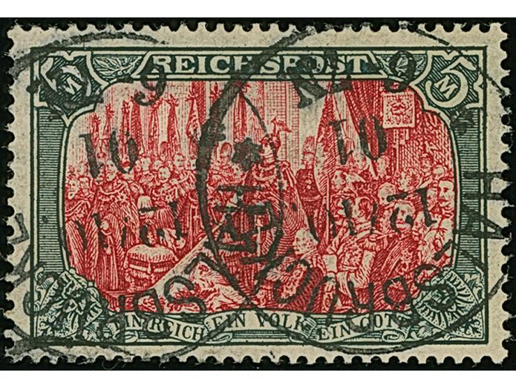 Reichspost 5 M., Type I ohne Nachmalung, mit zwei sehr klaren Stempel-Abschlägen “HALSBRÜCKE 12.10.01”. Die farbfrische Marke ist bis auf etwas verkürzten Zahn links oben links in einwandfreier Erhaltung. Trotz dieser winzigen Einschränkung ein besonders schönes Exemplar dieser schwierigen Marke, Fotoattest Jäschke-L. BPP (2010)