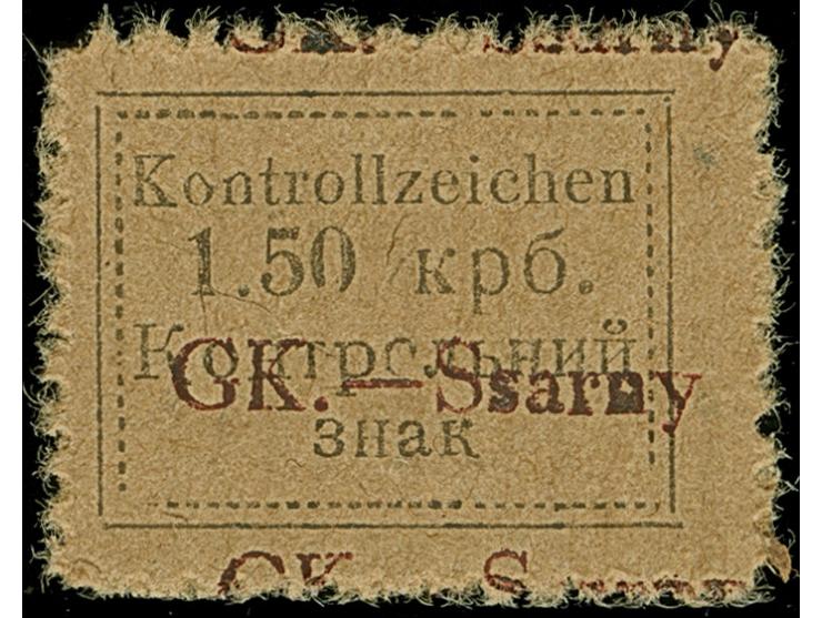 1941, Kontrollzeichen mit Aufdruck 1,50 Krb. mittelockerbraun auf senkrecht gestreiftem Papier, mit doppeltem Aufdruck, farbfrisch und gut gezähnt, ohne Gummi wie verausgabt, tadellos. Eine sehr seltene Marke, wenngleich die Auflage 11 Stück betragen soll, hat ProFi lediglich ein weiteres Stück registriert, sign. UPV und EKeiler sowie Fotoattest Zirath BPP (2008)