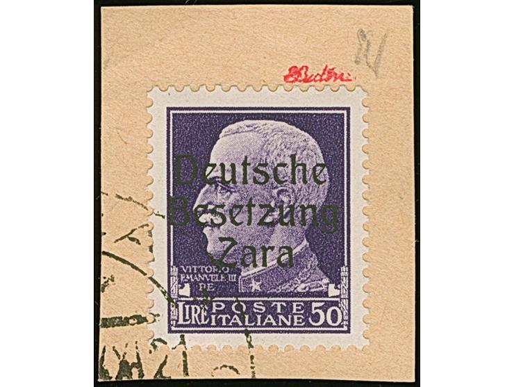 50 Lire schwärzlichgrauviolett, farbfrisch und gut gezähnt, sauber mit Teil-Ersttagsstempel “ZARA /ARRIVE E PARTENZE -9.10.43)” auf Briefstück, tadellos. Eine der ganz großen Seltenheiten der Besetzungsausgaben, Gesamtauflage über alle Typen nur 47 Stück, das Gros davon ist ungebraucht bzw. postfrisch registriert, in gestempelter Erhaltung hat ProFi lediglich 3 Stück registriert, sign. ELudin sowie Fotoattest El Majdoub BPP (2026)