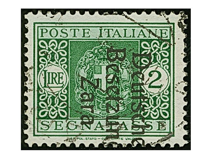 1943, 2 Lire dunkelgrün, Aufdrucktype II, Wasserzeichen rechtsliegend, farbfrisch und gut gezähnt, sauber gestempelt, tadellos, eine seltene Marke, u.a. sign. Ludin BPP mit Fotoattest (1981) und Fotoattest Krischke (2010)