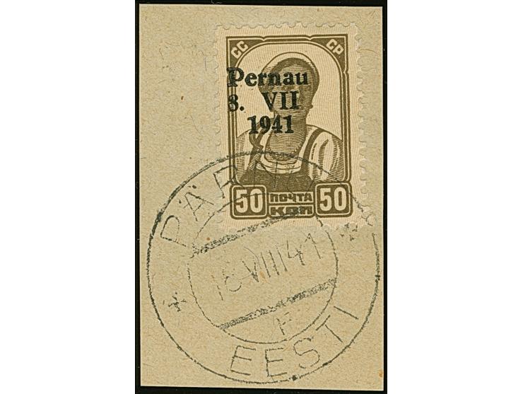 1941, 50 Kopeken braun, farbfrisch und gut gezähnt, sauber mit Stempel “PÄRNAU 18 VIII 41” auf Briefstück, tadellos, eine, besonders in gestempelter Erhaltung, sehr seltene Marke, Fotoattest Krischke BPP (1996)