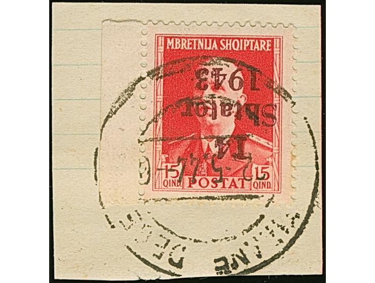 1943, 15 Qind dunkelrosa, linkes Seitenrandstück mit kopfstehendem Aufdruck, sauber mit Stempel “TIRANE DEGE 22-.5.44” auf Briefstück, tadellos, in gestempelter Erhaltung sehr selten, Fotoattest Brunel (2016)